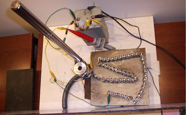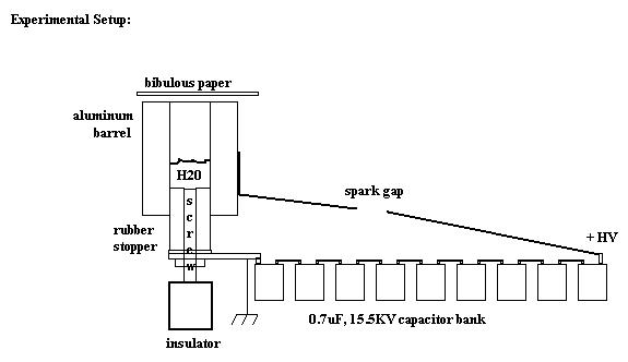 The water arc launcher was constructed as shown below. A spark gap was used so that the capacitor bank would charge up to the desired voltage, and then the electrical discharge on breakdown would follow a path through the water projectile. Fig. 1: The capacitor is 50 x 35uF, 33VDC in series. The caps are photoflash capacitors. A sheet of Plexiglas was put in front of the device as a shield. The capacitors were charged up with a 0-20 KV high voltage power supply prior to firing. A small amount of water (1-2 mL) is pipetted into the barrel. The electrical circuit is completed from ground, through the screw, to the water slug, through the aluminum barrel, to the spark gap, that then connects to the H.V. side of the capacitor bank at the moment that an arc occurs in the gap.