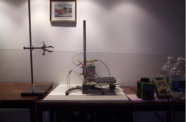 Experimental Results: At 11.7kV, it took several arcs with a quiet snap before the water exploded with a loud bang (about the 5th time). It was not so loud as to be painful, though. It blew the bibulous paper off to a height of a couple of feet and put a hole through one sheet of it. It was soaked with water. Interestingly, the rubber stopper was not moved, nor did it appear damaged. It still continued to hold the water in. The stopper was press fit into the barrel, and was held in the breach by the pressure from the insulator, connected to the table below. Fig. 2: Picture of the Experimental Setup.